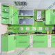 Фасады: пластик «0660 салатовый» и «0200 ваниль», 3D кромка двухцветная «жёлтый/сталь DC24R9», стекло «Мастер Каре» в алюминиевом профиле, столешница (снята с производства) с 3D кромкой «Золотая кисть 1322E».