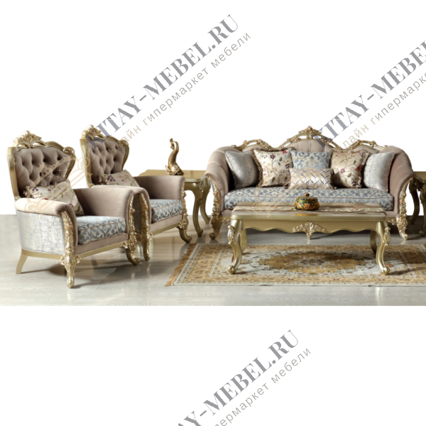 Мягкая мебель выполнена в классическом стиле. Материал изготовления массив, отделка ткань. Использование в декоре неповторимых тканей, резных элементов, украшенных золотом, придает мебели королевское величие. Роскошь и уют создают аксессуары к мягкой мебели — подушки из превосходной ткани.