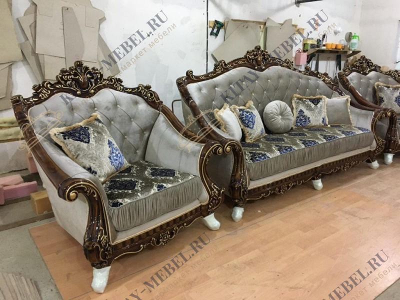 Все элементы мебели выполнены из высококачественных материалов: дерево, ЛДСП, МДФ, высокопрочная мебельная ткань, благодаря которым мебель Султан долговечна и практична. Резные ножки, фигурные накладки, величавая корона над диваном и креслом придают гарнитуру благородства. Каретная стяжка на мягких спинках только подчёркивает принадлежность мебели к королевским апартаментам.