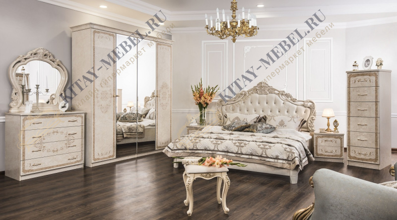 КОМПЛЕКТ: КРОВАТЬ, ТУМБА ПРИКРОВАТНАЯ (2ШТ), ТУАЛЕТНЫЙ СТОЛИК С ЗЕРКАЛОМ + ПУФ, КОМОД, ШКАФ 4-ЕХ ДВЕРНЫЙ ПАТРИСИЯ КРЕМ КОРЕНЬ ГЛЯНЕЦ